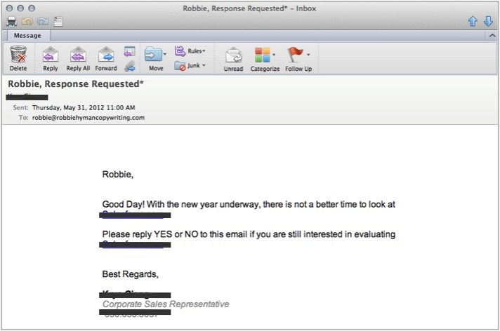Next comes this: “Please reply YES or NO to this email if you are still interested…”